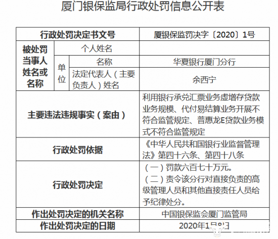 近日,据银保监会网站公布的行政处罚信息公开表显示,华夏银行厦门分行因利用银行承兑汇票业务虚增存贷款业务规模、代付易结算业务开展不符合监管规定、普惠龙E贷款业务模式不符合监管规定。依据《中华人民共和国银行业监督管理法》第四十六条、第四十八条,中国银保监会厦门监管局对华夏银行厦门分行罚款六百七十万元,并责令该分行对直接负责的高级管理人员和其他直接责任人员给予纪律处分。