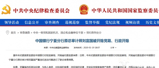 去年10月,其嫌严重违纪违法,接受纪律审查和监察调查,时隔3个多月,终于出了结果。依据《中国共产党纪律处分条例》和银行有关规定,经中国银行党委研究决定,给予刘富国开除党籍、行政开除处分;收缴其违纪所得;将其涉嫌受贿犯罪问题移送检察机关依法处理,所涉款物随案移送。