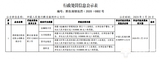 近日,据中国人民银行贵阳中心支行公布的行政处罚信息公示表显示,贵州银行股份有限公司(以下简称“贵州银行”)黔东南分行存在金融统计类、支付结算类、货币金银类、国库类违法违规行为。