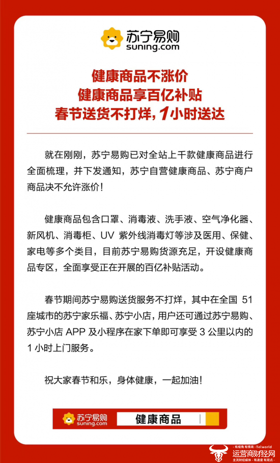 就在刚刚,苏宁易购已对全站上千款健康商品进行全面梳理,并下发通知,苏宁自营健康商品、苏宁商户商品决不允许涨价。