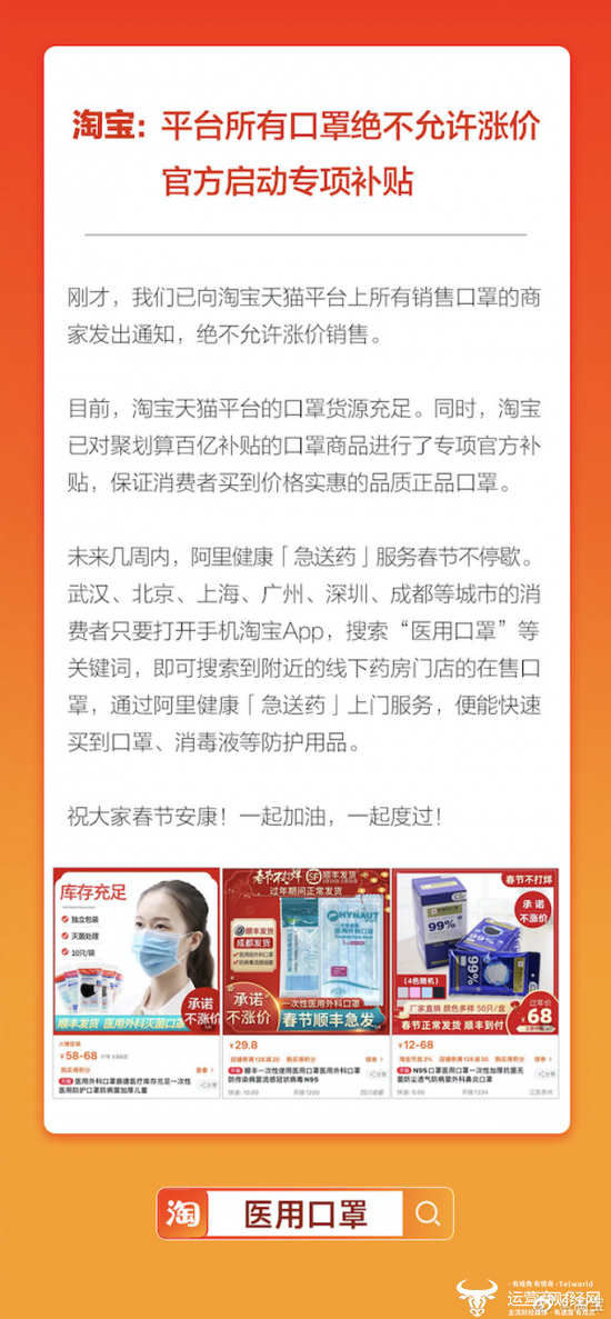 淘宝发布微博称"不允许任何的口罩涨价",称货源充足,并对聚划算的口罩商品进行专项补贴,同时未来几周内,阿里健康“急送药”服务春节不停。