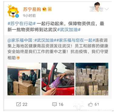 在疫情后方,不少后勤保障单位、组织也是做好了充足的准备。1月23日,苏宁旗下家乐福中国官方微博发布了一条关于 #家乐福坚决不涨价,亏钱也不能涨!# 的微博表示,家乐福中国管理团队承诺春节期间民生用品不涨价,同时针对武汉及全国范围都提前备好充足货量,誓与全国人民一起共渡难关。