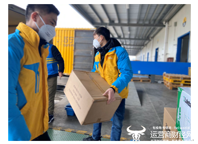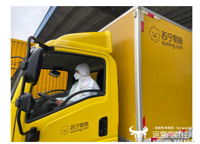 (图:苏宁华中物流园,苏宁快递员将防疫物资装车送往送到医务工作者、快递员与前线记者手中)