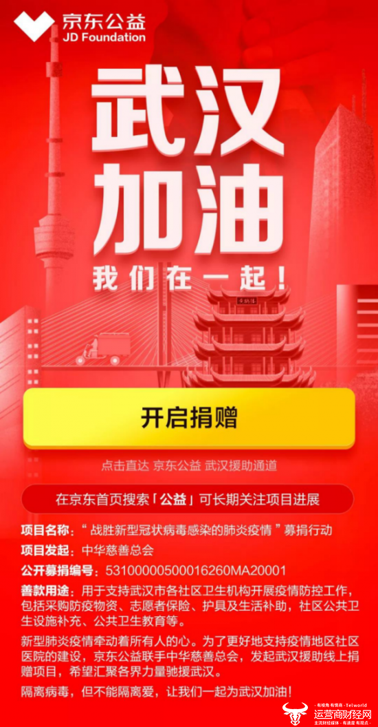 而京东驰援武汉的脚步一直在继续,在1月26日,京东还联合中华慈善总会在京东暖东公益平台上线了“战胜新型冠状病毒感染的肺炎疫情”募捐行动,募捐款项将用于支持武汉市各社区卫生机构开展疫情防控工作,包括采购防疫物资、志愿者保险、护具及生活补助,社区公共卫生设施补充、公共卫生教育等。