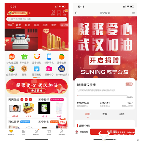 1月26日,苏宁互联网公益平台上线“抗击新型肺炎疫情”公益项目,为网友提供爱心捐赠的新通道,进而支持疫情防控第一线的工作。