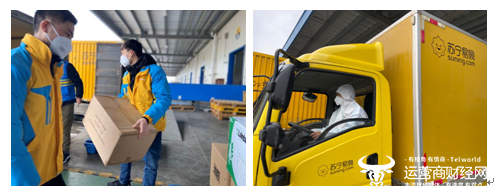 (图:苏宁华中物流园,苏宁物流将防疫物资装车送到医务工作者、前线记者、快递员手中)