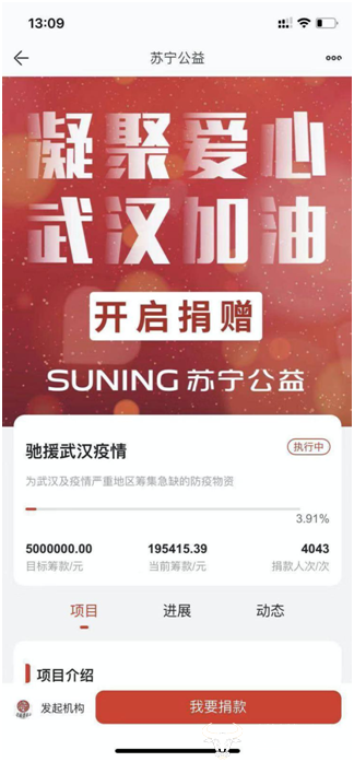 (图:苏宁互联网公益平台上线“抗击新型肺炎疫情”公益项目)