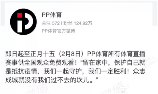 为了打赢防疫之战,苏宁还鼓励大家在春节期间,留在家中,保护自己就是抵抗疫情,苏宁旗下体育视频直播平台PP体育官宣开放版权,即日起至正月十五(2月8日)PP体育所有体育直播赛事供全国观众免费观看。
