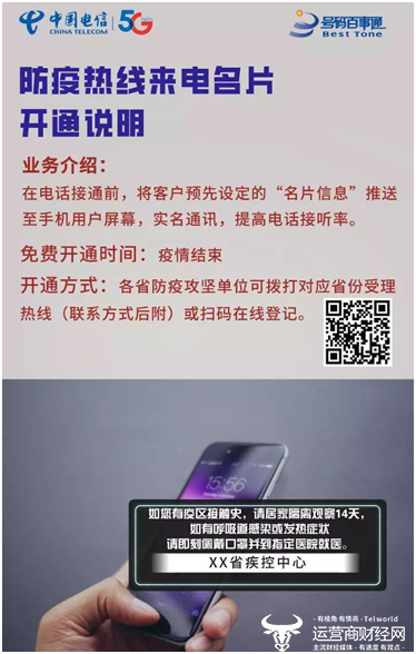 在全国加强肺炎疫情防控之际,中国电信为各省防疫热线免费开通来电名片“疫情防控”业务,通过实名通话和政策宣导功能,保障防疫工作有效进行。