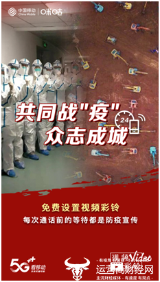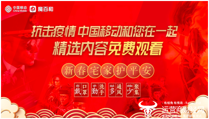 2020年新春之际,新型冠状病毒感染肺炎疫情防控形势严峻,疫情动态牵动人心。为响应疫情防控工作,中国移动积极担当社会责任,在全力保障疫情防控工作通信信息服务畅通的基础上,面向全国个人用户开展多项特色业务免费体验活动:包括视频彩铃、魔百和、咪视通、咪咕视频、咪咕阅读、手机报等,创新将通信网、广电网、互联网等三网业务和全场景新体验融合,向全国亿万用户发送防疫知识、提供免费精彩内容,丰富大众精神文化活动,陪伴大家共同度过一个健康年。