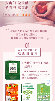 如果你想阅读相关书籍学习疫情防控知识,可使用咪咕阅读客户端免费畅读(听)全站图书、漫画、杂志等全站内容,目前咪咕阅读已经覆盖7528万用户,足不出户就能享受精神之旅。