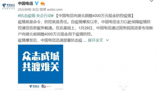 紧接着,1月29日,中国电信宣布,通过国务院国资委专用账户向湖北省捐赠4000万元现金用于疫情防控;同时,中国联通宣布向湖北捐款3000万元 。