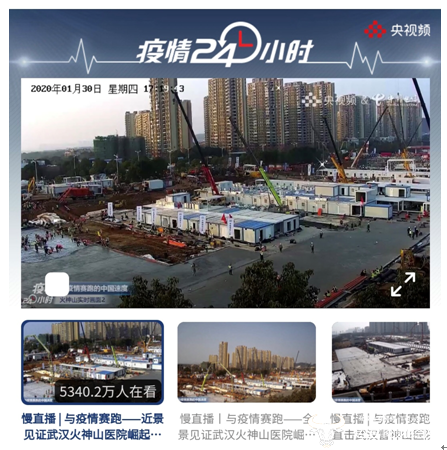 1月28日22时59分,深夜未眠的记者在手机上打开央视频慢直播平台,清楚地看到武汉火神山医院的建设现场,感受着与疫情赛跑的中国速度,心里默默为武汉人民、为全国人民加油。彼时,全国共有1991万网友与记者一起观看直播,远程“云监工”。截至记者发稿时,在这一平台上,同步在线观看火神山和雷神山医院建设现场直播的用户已经超过了5000万。