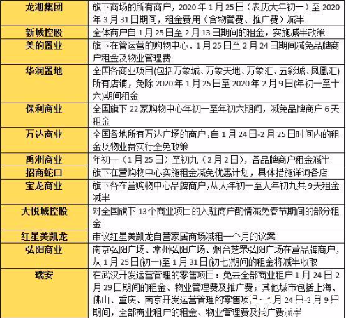 此外,中国网消息还显示,保利商业宣布减免旗下22家购物中心年初一至初六的租金;卓越旗下购物中心卓悦汇、卓悦INTOWN在初一至初七对各品牌商户的7天租金减半;宝龙商业从初一至初九给予旗下各在营购物中心品牌商户共9天租金减半。