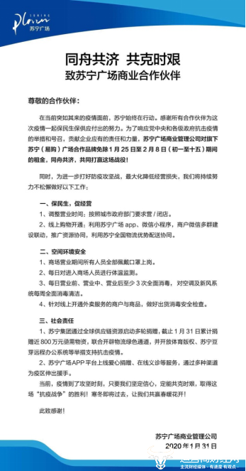 1月31日,苏宁广场商业管理公司宣布对旗下苏宁广场、苏宁易购广场合作品牌免除1月25日-2月8日期间租金,携手品牌商户共克时艰抗击疫情,同时在经营赋能、打造安全购物环境等方面升级服务。