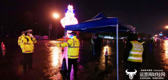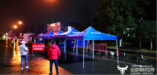 1月30日晚,自贡天空下着雨,在自贡市渝昆高速公路自贡站出口处,公安交警、卫生医疗等部门工作人员,以及青年志愿者们正在现场开展疫情防控工作。