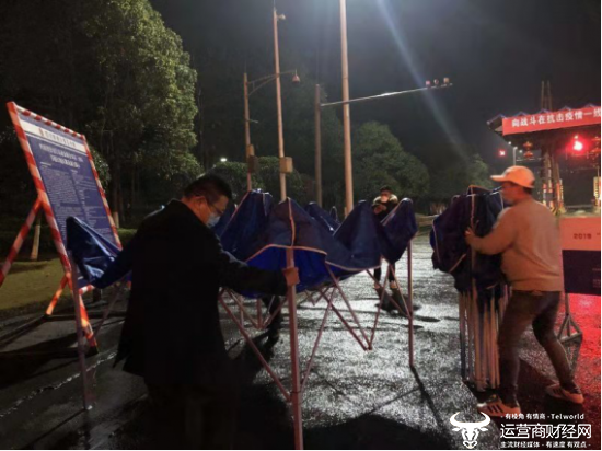 随着雨势的增大和气温降低,给现场人员带来不小的考验。就在此时,一辆电信服务车从市区方向驶来,停在了志愿服务点前。车上下来多名工作人员,快速抬下4顶帐篷,并招呼志愿者们协助搭建。他们还在现场设计勘察布线,架设了免费的WIIF网络。