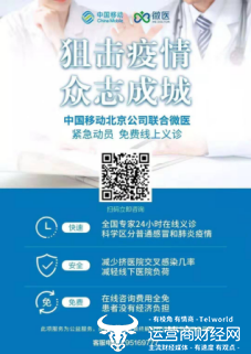 另外,为抗击疫情,中国移动北京公司还联合微医共同开展免费在线问诊,扫描下方二维码,登陆北京移动APP首页,查看“在线问诊”服务,全国专家24小时在线问诊,为你实时解答疫情疑问并提供就医指南。抗击疫情,中国移动和你在一起!