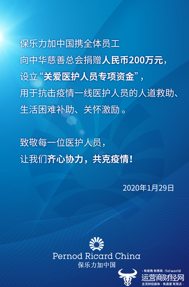 截至目前,保乐力加中国携全体员工向中华慈善总会捐赠200万元,