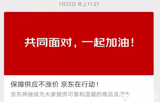 早在1月22日,京东就发布公告《保障供应不涨价 京东在行动》,介绍京东在充分保障自营商品价格稳定的同时,对第三方商家的商品也进行了严格的管控,禁止销售口罩的商家出现涨价行为,一旦确认价格异常上涨,会第一时间下架违规商品并对违规商家进行处理。