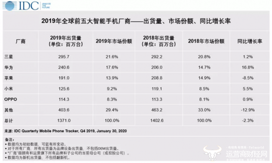 苹果出货量1.98亿部,同比下降7%,市场份额14.5%,位居第三。要不是苹果2019年第四季度把iPhone 11降价销售,结局可能更糟糕。