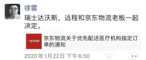 1月22日下午,还在瑞士达沃斯参加世界经济论坛的京东零售集团CEO徐雷,在手机上发了一条朋友圈,转发了“京东物流关于优先配送医疗机构指定订单的通知”,而这一决定是他与同在达沃斯的京东物流集团CEO王振辉共同作出的。