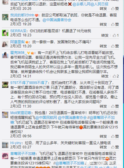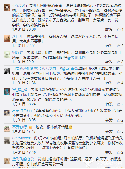 早在1月21日中午,携程、去哪儿、飞猪官方微博分别发布消息,推出退改保障政策,然而,对各个平台退改票的投诉迄今都没消停,去哪儿网也是一样。