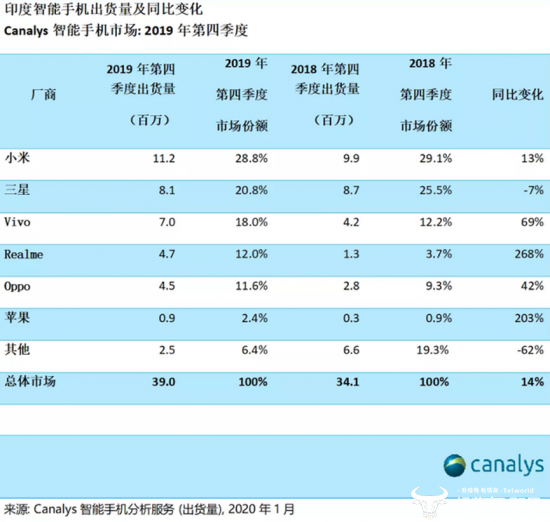 没想到这一策略相当奏效,在全球前五大手机品牌中,小米实现了最高单季增速。Q4出货量达3300万台,增幅高达23%,市场份额增长为9.0%,市占率继续居于全球第四。