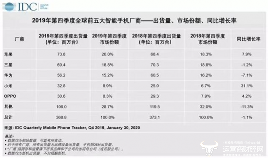 而第四季度,华为手机销量不佳,因境外市场压力下滑7%,而其余品牌皆实现同比增长。包括苹果、小米,前十大厂商中有八家在第四季度实现了增长。
