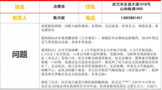 其中最严重的是陈峰一家。这位通信人家中有两位危重病人。其中一位是78岁高龄老人,另一位曾经因病切除了一个肺,单肺感染非常严重。两位患者在家隔离,均已在社区做了核酸检测,截止目前依旧没有结果。两人目前呼吸困难,只能靠氧气机维持,生命危在旦夕。人民日报的新型肺炎求助通道已经填写,社区也在帮忙联系医院,但还是没有床位,也不知道什么时候才能入院治疗。患者现在的病情越来越严重,不能继续在家拖延隔离,故此紧急求助,希望大家能帮忙转发扩散,让病人拥有一线生机!谢谢!