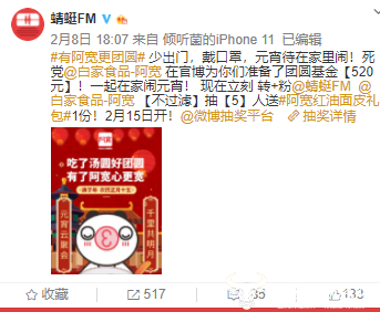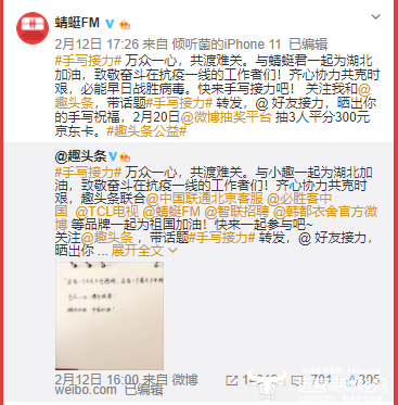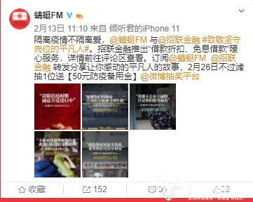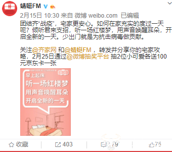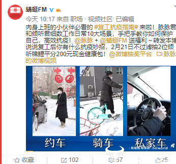 例如,蜻蜓FM官方微博的其中一条管方微博写道:肉身上班的小伙伴必看的 #复工抗疫指南# 来啦!脉脉君和倾听君细数工作日常10大场景,手把手教你如何保护自己,高效抗疫!@脉脉 + @蜻蜓FM 送福利~转发本博说说复工后你有什么抗疫妙招,2月21日不过滤抽2位倾听锦鲤平分200元现金健康包!@微博抽奖平台 。