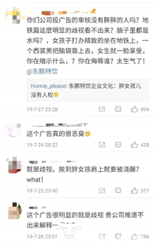 东鹏特饮将该广告在官博上一经发出便受到不少网友的攻击,不少网友认为该广告存在歧视肥胖女性的意味。有网友指出“女孩打扮精致的在地铁上,一个西装男把脑袋靠上去,女生就一脸享受,是在暗示什么?”