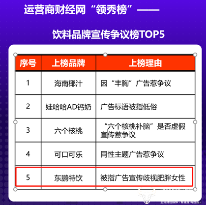 运营商财经网 刘慧敏/文去年一年来,由于广告营销引发争议的企业不在少数,除海南椰汁“丰胸广告”、娃哈哈AD钙奶“从A到D”宣传标语外,此次疫情捐赠大方的东鹏特饮也因地铁广告歧视肥胖女性备受争议,上榜“年度饮料品牌宣传争议榜TOP5”。