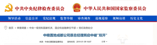 信息显示,“经中粮集团有限公司党组会议研究,决定给予熊启中开除党籍、开除公职处分;收缴其违纪所得;四川省监委将其涉嫌犯罪问题移送检察机关依法审查起诉,所涉财物随案移送。”
