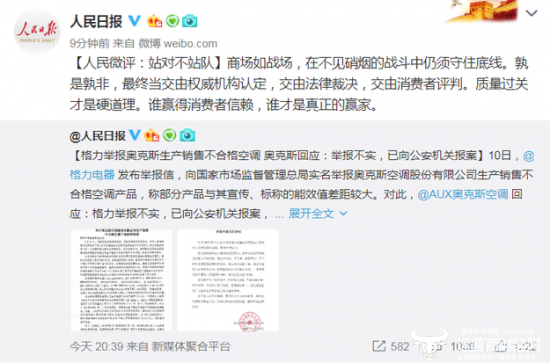 当时,格力实名举报奥克斯生产销售不合格空调,奥克斯则回应格力涉嫌不正当竞争。不仅牵涉到了中国市场监管局,甚至连人民日报都发表微博评论称:人民微评:战对不站队。