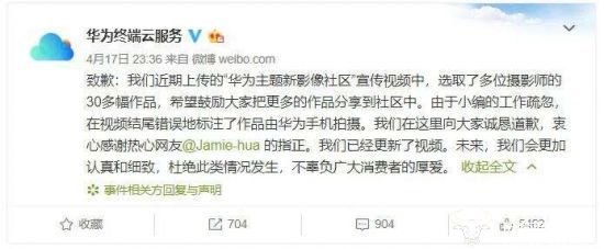 经过网民的激烈辩论后,网民发现,华为致歉了,华为终端云服务官方发文称:我们近期上传的“华为主题新影像社区”宣传视频中,选取了多位摄影师的30多幅作品,希望鼓励大家把更多的作品分享到社区中。由于小编的工作疏忽,在视频结尾错误地标注了作品由华为手机拍摄。我们在这里向大家诚恳道歉,我们已经更新了视频。未来,我们会更加认真和细致,杜绝此类情况发生,不辜负广大消费者的厚爱。