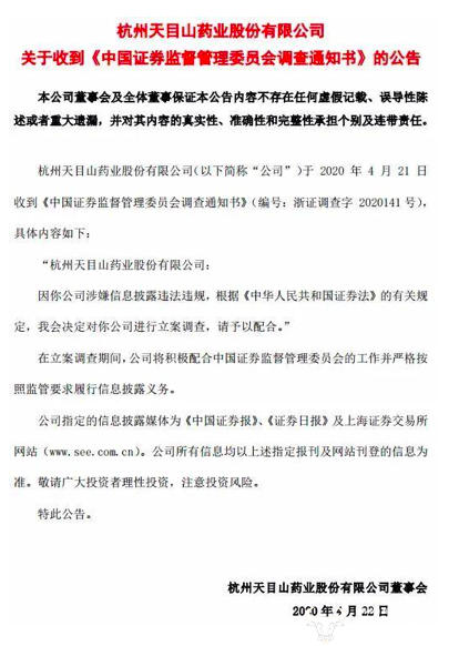 2020年4月22日,天目药业自身因公司涉嫌信息披露违法违规,中国证监会决定对其进行立案调查。受此影响,投资者索赔登记已经启动。