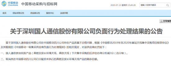 日前,运营商财经网才报道了关于《独家:深圳国人通信产品质量出问题被中移动处罚 取消份额并扣分》一文。然而,知情人士再次透露,其在四川移动存在产品质量不合格问题,要取消已分配但未执行的高楼及狭长环境天线产品的剩余份额,还有扣减同类产品参加下次集中采购的后评估总得分3分(百分制)。