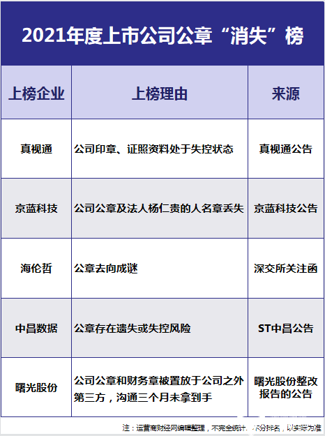 公章之于企业是如同身份证般的存在,必不可少也是重中之重,但是在2021年,身为上市公司的中昌大数据却发布公告,宣布公司公章一直未移交,存在上述印章遗失或失控的风险。也因此登上运营商财经网推出的2021年上市公司公章“消失”榜。