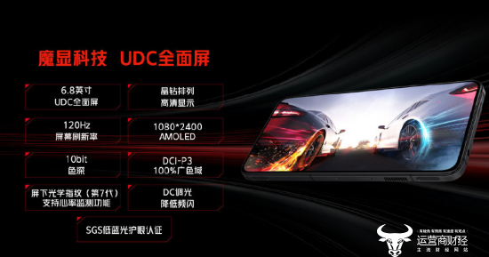 红魔7Pro还搭载全新一代魔显技术——UDC屏下摄像真全面屏,6.8英寸UDC全面屏,1080*2400分辨率,屏幕最高刷新率120Hz,DC调光可降低频闪,通过了SGS低蓝光护眼认证。