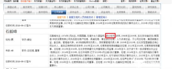 石毅峰出生于上个世纪70年代。据爱企查和企查查显示,石毅峰为清华大学工商管理硕士;东方财富网则显示,石毅峰为清华大学硕士学历。网上无法查到石毅峰的本科毕业院校,以及其清华大学工商管理硕士学位是否参加全国统考的硕士研究生?是全日制还是在职的?