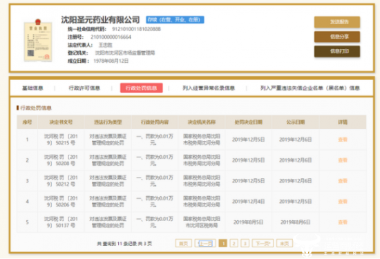 另外,国家企业信用信息公示系统显示,沈阳圣元药业有限公司曾有11条行政处罚记录,违法行为类型均为“对违法发票及票证管理规定的处罚”。