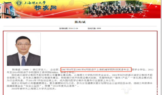 但据上海理工大学校友网显示,陈海斌在1987年至1991年就读的是上海机械学院科技英语专业。