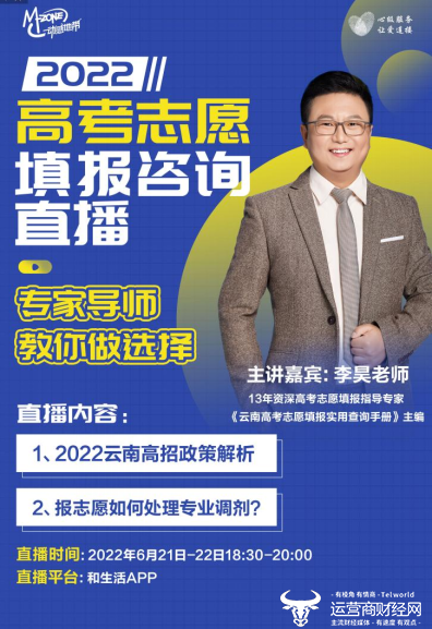 据了解,为了帮助省内考生发挥考试成绩的最大效益,6月21日至22日,云南移动将举办2022高考志愿填报咨询直播,邀请13年资深高考志愿填报指导专家、《云南高考志愿填报实用查询手册》主编李昊出席直播,为广大考生、家长解读高考政策,了解院校、专业填报技巧。