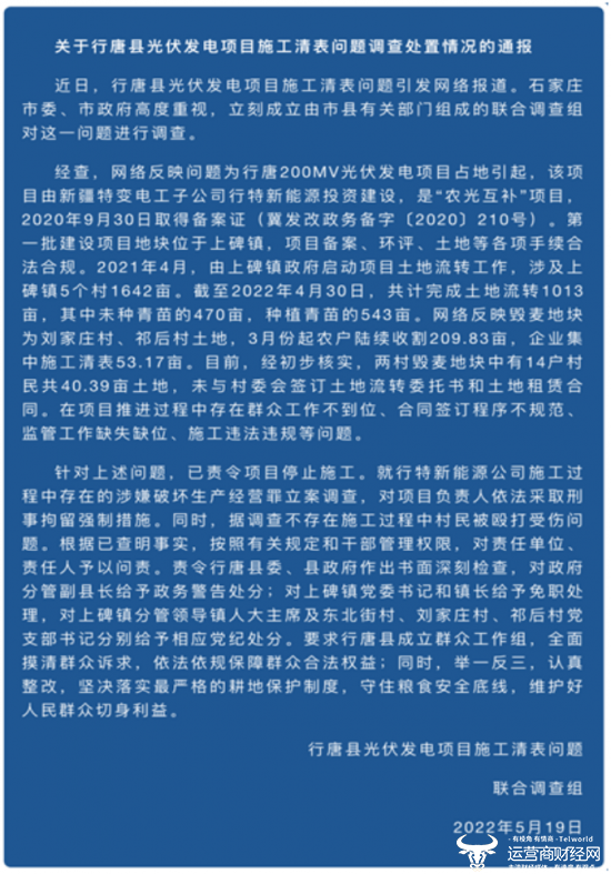 今年5月间,特变电工旗下子公司因涉嫌破坏生产经营罪被立案调查,其正在建设的行唐县200MW光伏项目被责令停工,项目负责人被刑拘。