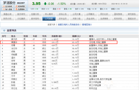 据东方财富网显示,黄惠华是2020年9月17日正式进入梦洁股份,担任总经理兼非独立董事。据悉,黄惠华在梦洁股份的薪酬为60万元,而董事长姜天武则为30万元。在整个高管团队中黄惠华的薪酬是最高的,只有一个副总经理成艳与她薪酬同为60万元。