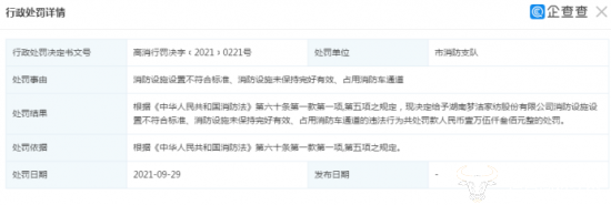 据高(消)行罚决字﹝2021﹞0221号显示,梦洁股份因消防设施设置不符合标准、消防设施未保持完好有效、占用消防车通道,违反了《中华人民共和国消防法》第六十条第一款第一项,第五项之规定,决定给予湖南梦洁家纺股份有限公司消防设施设置不符合标准、消防设施未保持完好有效、占用消防车通道的违法行为共处罚款人民币15300元的处罚。