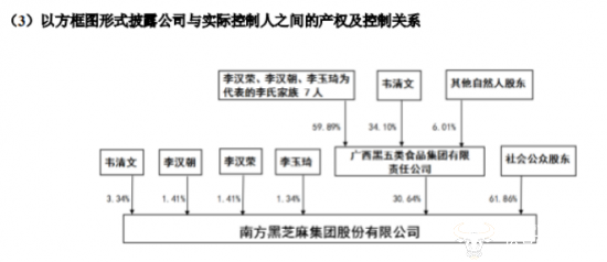 有文章称,南方黑芝麻的高管层有两大家族。最初与韦清文一起创办黑五类集团的李汉朝、李汉荣和他们的侄子李玉琦也是南方黑芝麻的实际控制人,并且李氏家族7人还掌握黑五类集团59.89%的股份,比韦清文的控股比例还高出15%以上。