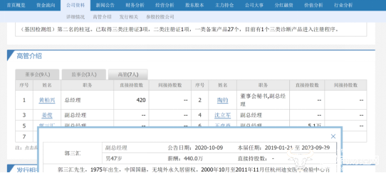 郭三汇的从业经历也值得一提,据同花顺财经显示他2000年就进入到了杭州迪安医学检验中心有限公司,但在迪安诊断的官网显示公司是2001年才成立的。他刚进该公司就担任了大区经理一职,之后成为该公司的总经理。11年后他去往南京迪安医学检验所有限公司担任总经理,彼时的他为36岁。
