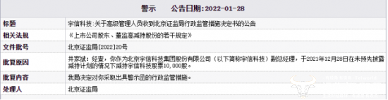 据北京证监局[2022]20号显示,井家斌作为北京宇信科技集团股份有限公司副总经理,于2021年12月28日在未预先披露减持计划的情况下减持宇信科技股票10,000股。违反了《上市公司股东、董监高减持股份的若干规定》,所以决定对井家斌采取出具警示函的行政监管措施。